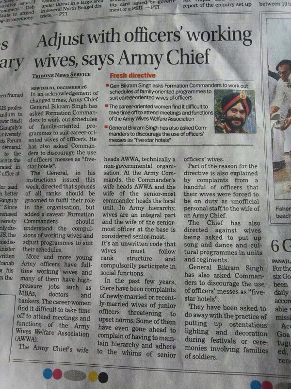 UncategorizedArmy Chief supports working wives of officers January 30, 2014 Anamika Nandedkar The Chief’s heart seems to be in the right place. How much of this trickles down, remains to be seen. Share this: Click to share on X (Opens in new window) X Click to share on Facebook (Opens in new window) Facebook Click to share on Pinterest (Opens in new window) Pinterest Like Loading... Related Published by Anamika Nandedkar View all posts by Anamika Nandedkar