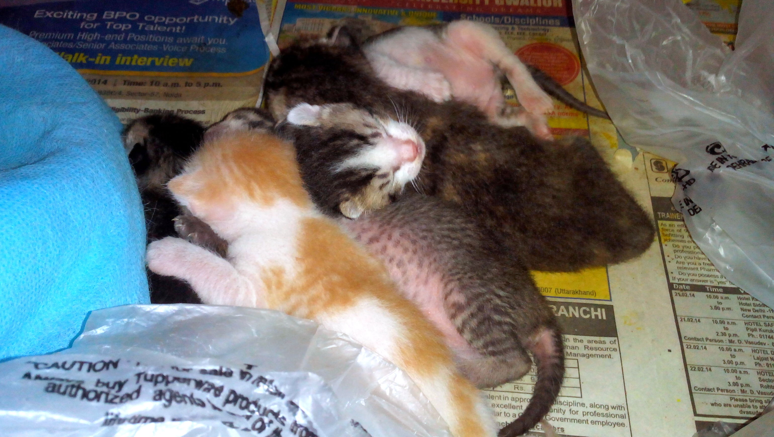 Chhoni had never behaved this way and I immediately sensed that maybe it was time for her to deliver her kittens. With the emergency light, I set up camp in that boring room that night (early morning). I could ocassionally hear some moaning, but sleep got the better of me. I woke up after two hours when the lights came on. And I could hear squeaky meowing! Badhai ho! Hamare ghar naya mehmaan aya hai. Err… ek nai, 5 aye hain.