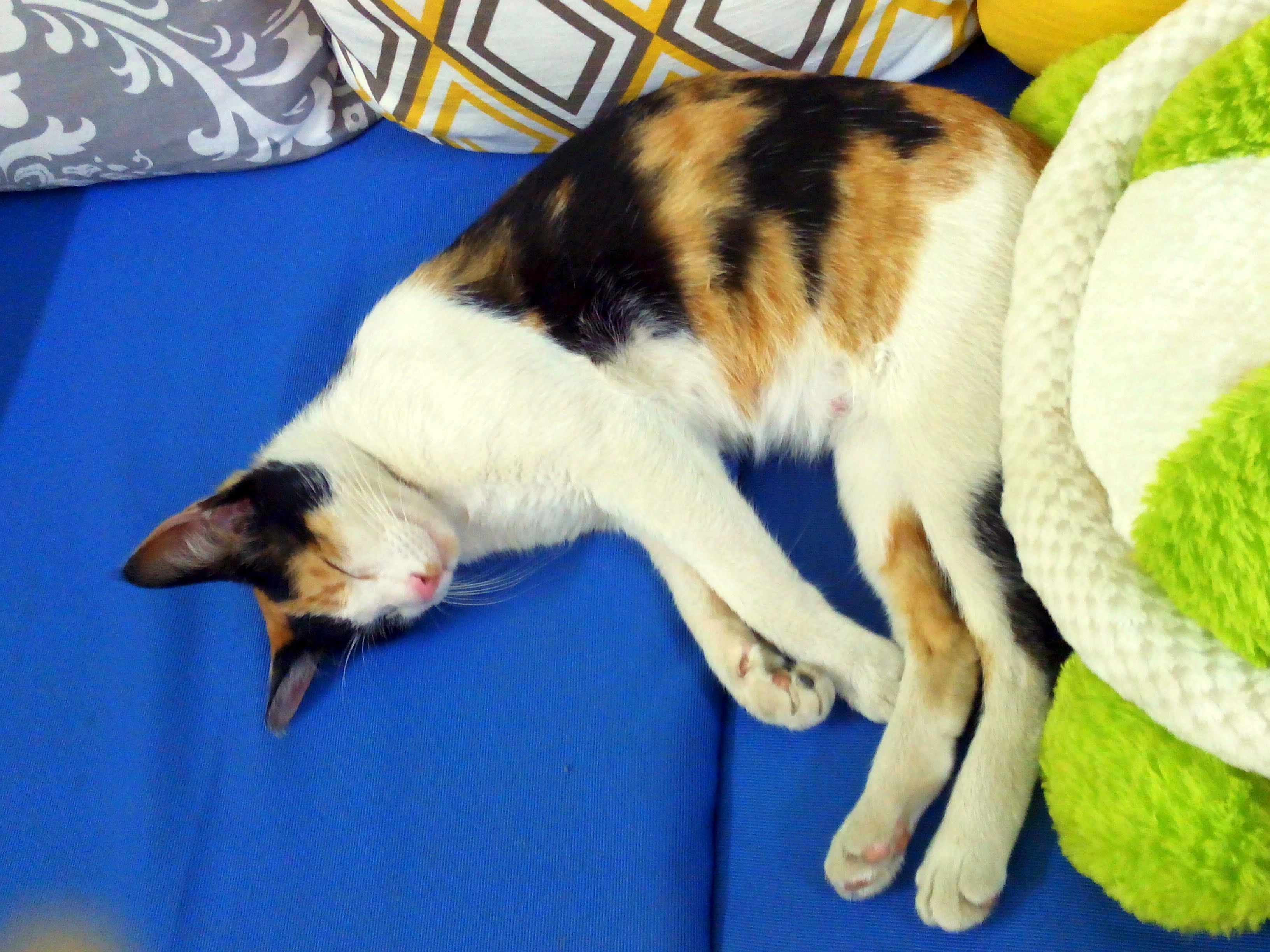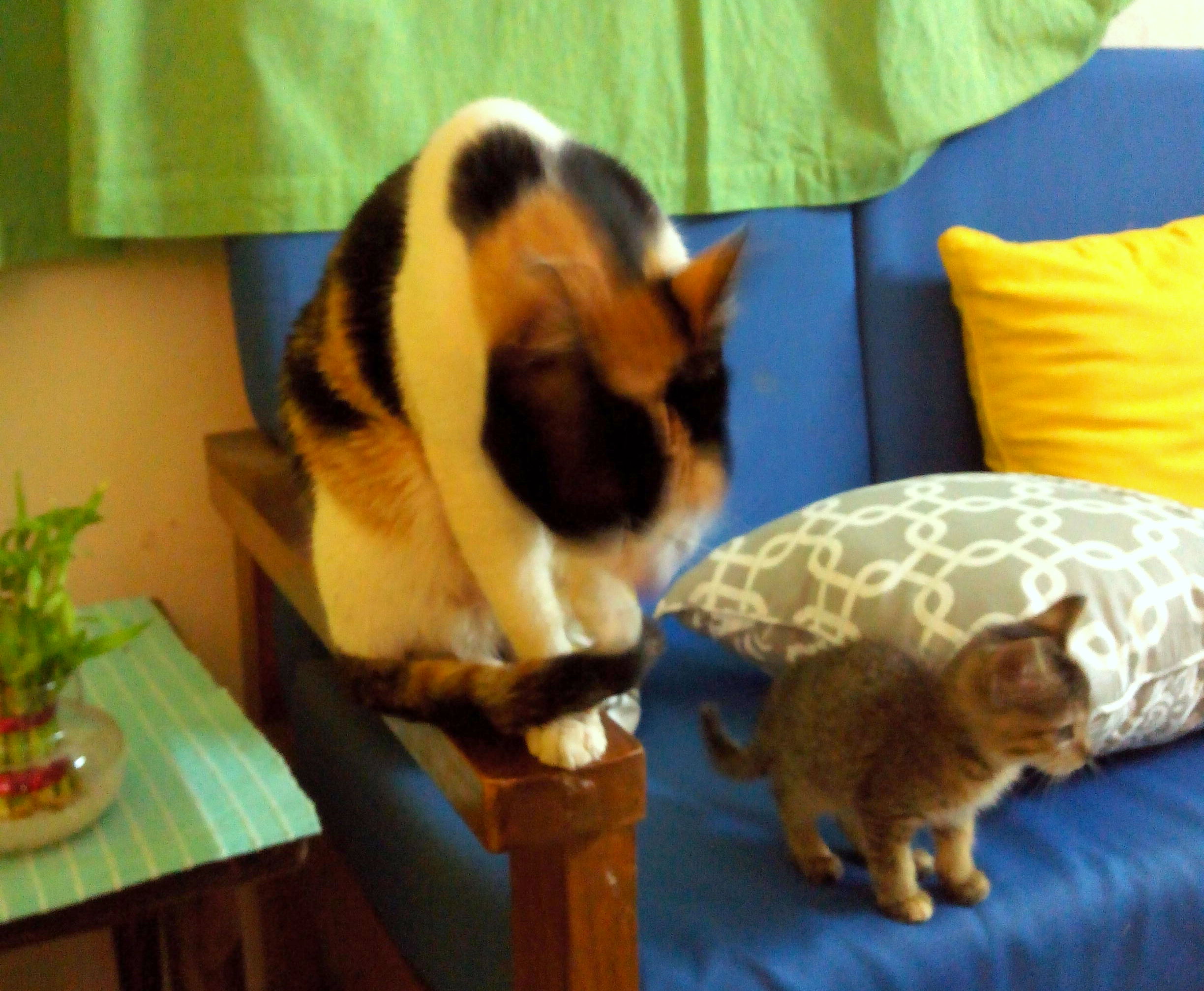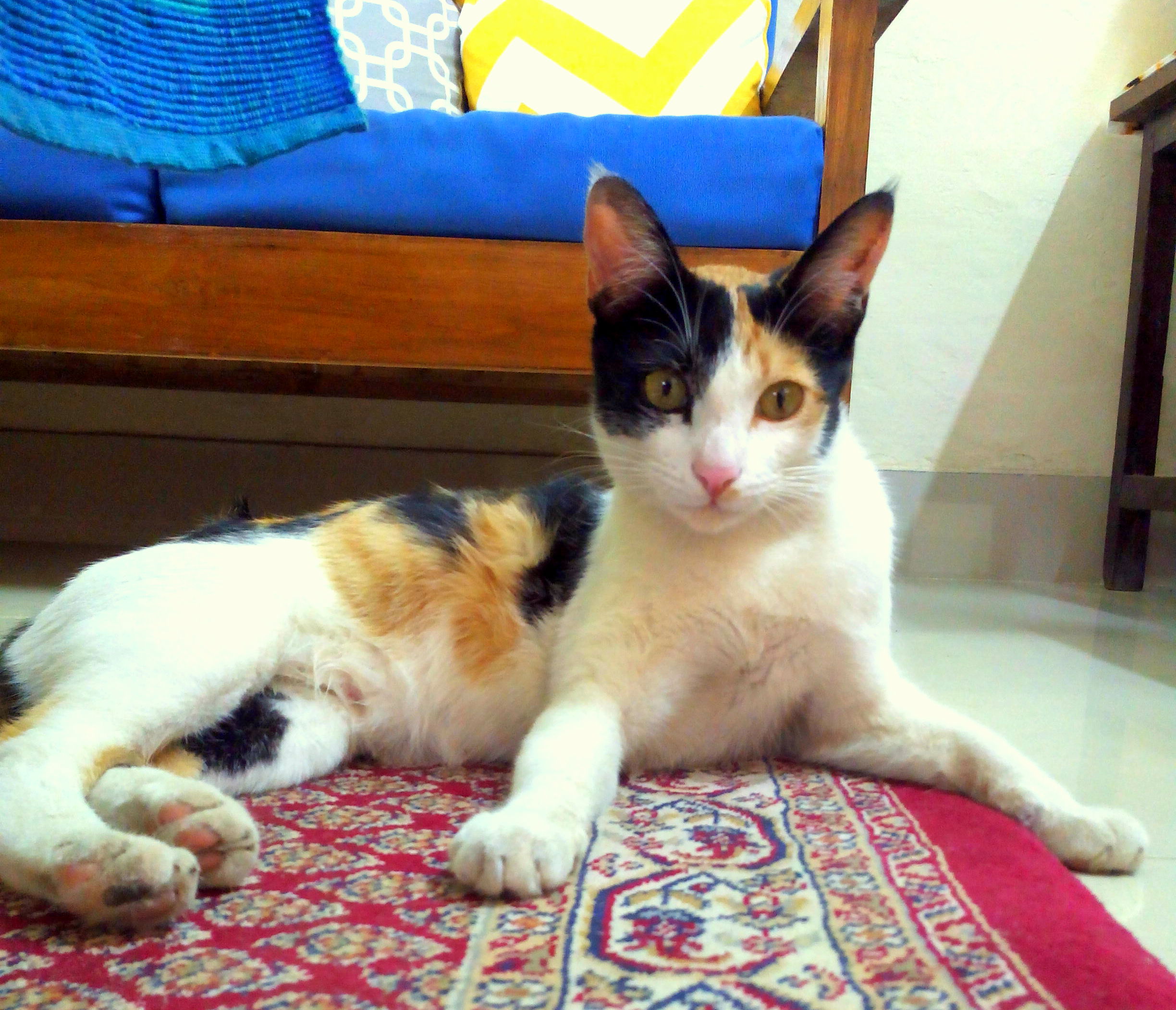 She started stopping by for naps in the hot afternoons too. Yes, she got that comfortable in our house. She would come, drink milk, climb up on the sofa and sleep for 2-3 hours. So one fine day, when we both were in a particularly playful mood, I noticed that her movements had slowed a bit. It also looked like she had put on some weight.